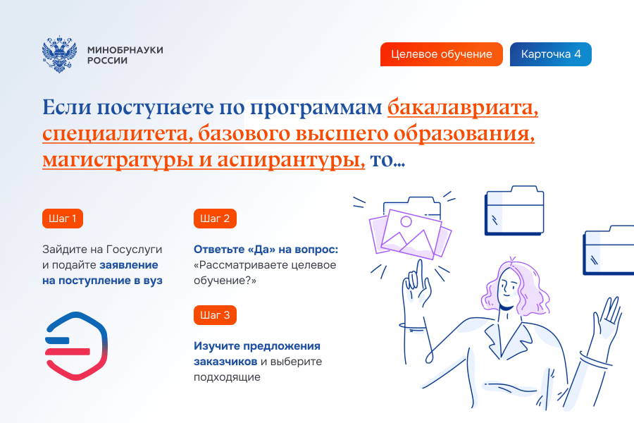 Шаг 3. Выберите вузы (научные организации) и конкурсные группы, в которые хотите поступить, и подайте заявление о приеме и необходимые документы. Не забудьте отметить заявлении о приеме конкурс по целевой квоте.