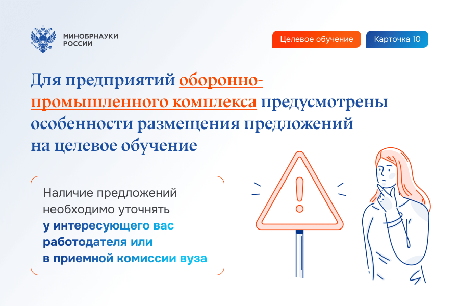 Для предприятий оборонно-промышленного комплекса, включенных в специальный перечень, предусмотрены особенности формирования предложений о заключении договоров о целевом обучении. Наличие предложений необходимо уточнять у интересующего вас заказчика или в приемной комиссии вуза (научной организации).
