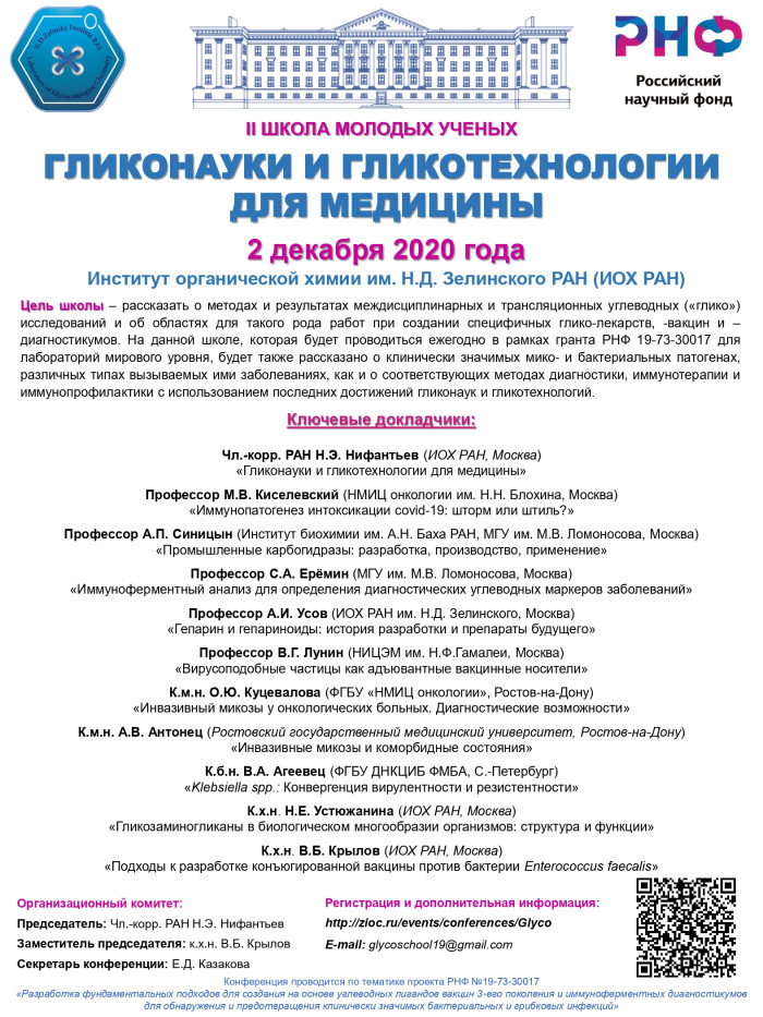 Институт органической химии имени Н. Д. Зелинского приглашает Вас принять участие в школе молодых ученых «ГЛИКОНАУКИ И ГЛИКОТЕХНОЛОГИИ ДЛЯ МЕДИЦИНЫ», которая пройдет 02 декабря 2020 года. Из-за ограничений, связанных с распространением вирусной инфекции COVID-19, школа проводится в очном (библиотека ИОХ РАН, Москва) и онлайн (через сервис ZOOM) форматах.