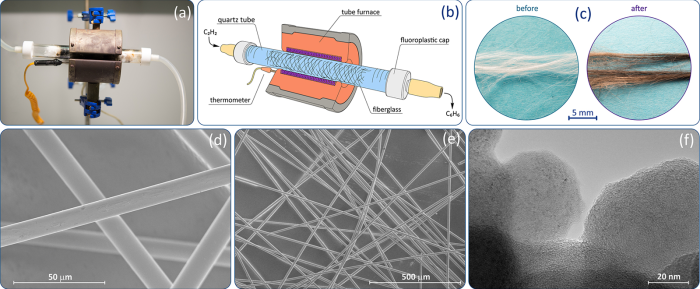 Рис. 4. (a) — фото экспериментальной установки, (b) — ее схема: ацетилен пропускают через толстую трубу, которая заполнена большим количеством тонких стеклянных трубочек, середина трубы помещена в печь, внизу находится термометр. (c) — фото стеклянных трубочек до и после реакции; (d) и (e) — СЭМ-снимки стеклянных трубочек после реакции; (f) — ПЭМ-снимки черного налета, извлеченного из трубочек. Рисунок из обсуждаемой статьи в Journal of American Chemical Society