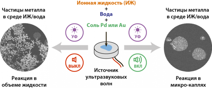 Облучение реакционной смеси, содержащей водорастворимую соль металла, воду и ионную жидкость, ультрафиолетом позволило получить желаемые частицы металлов без использования дополнительных реагентов. При этом проведение реакции в условиях непрерывной генерации механических волн приводило к существенному уменьшению размеров частиц за счёт смены режима протекания реакции и локализации реагентов в микро-каплях, что было наглядно продемонстрировано при помощи электронной микроскопии.