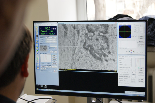 Затем всем желающим представилась уникальная возможность посмотреть работу просвечивающего электронного микроскопа Hitachi HT7700. На семинар участники пришли подготовленные- каждый принес свой образец, чтобы проанализировать их на сверхчувствительном микроскопе высокого разрешения.
