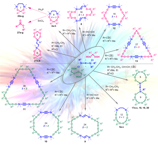 Впервые показана принципиальная возможность существования макроциклических и бициклических Si-пероксидов: синтезированы 6-, 9-, 12-, 18-, 24-, 27- и 36-членные циклы. Получен макроцикл, содержащий девять пероксидных групп в цикле — рекордное количество. 9-Членные бициклические Si‑пероксиды — это первый пример продуктов с шестью пероксидными группами в одной молекуле, выделенных в индивидуальном виде.
