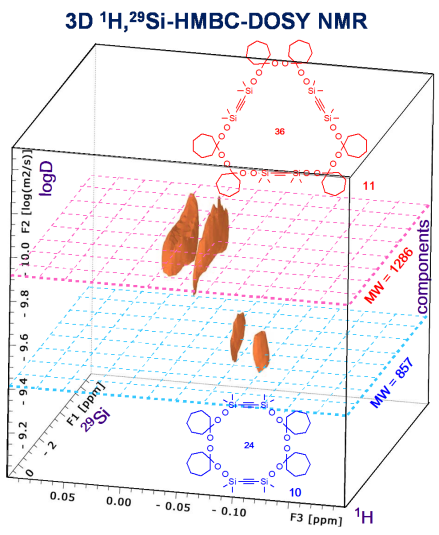 Разработана методика анализа гидролитически нестабильных соединений, в частности Si-циклов, методом 2D и 3D DOSY ЯМР спектроскопии в растворе CDCl3 с добавлением наноразмерного SiO2 в количестве 1 % от массы раствора.
