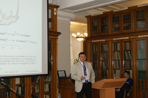 Электрохимическую тематику продолжил профессор из Института органической и физической химии им. А. Е. Арбузова Дмитрий Яхваров, который сделал доклад о электрохимичеком синтезе металлокомплексных катализаторов на основе переходных металлов (Ni, Co).