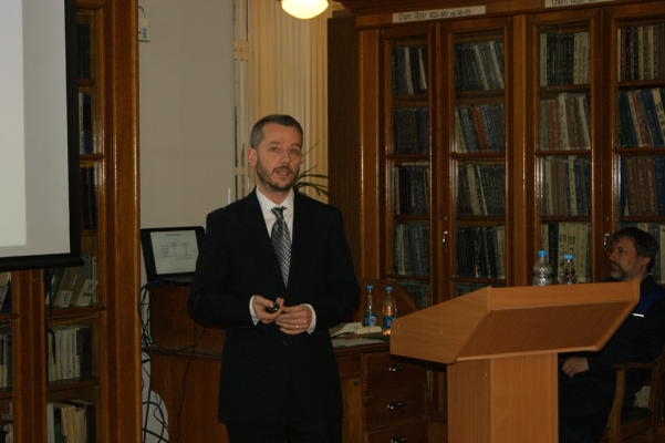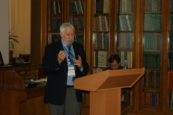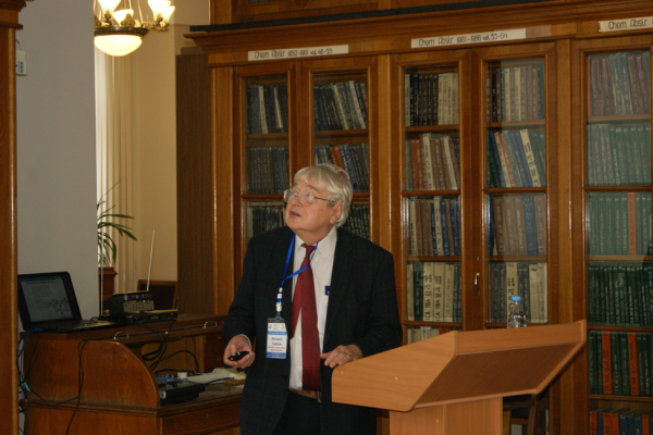 Профессор Хатчингс, первооткрыватель катализа на золоте, дал старт научной сессии семинара докладом о золотых катализаторах. Профессор рассказал о применении катализа на наночастицах золота не только в окислении СО в мягких условиях, но и в промышленном процессе получения винилхлорида гидрохлорированием ацетилена. Особое внимание докладчик уделил последним достижениям в исследовании активных центров золотосодержащих каталитических систем.