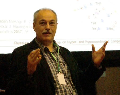 Второй день семинара открыла лекция профессора Университета Ренна Вячеслава Жуйкова (Viatcheslav JOUIKOV), рассказавшего о реакциях переноса электрона в гипо- и гиперкоординированных соединениях элементов «семейки углерода»