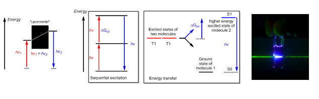 Но если термодинамика непримиримый и непобедимый враг, то оказавшись на ее стороне вы убедитесь, что это столь же надежный союзник. Превращать мягкое излучение в жесткое оказалось возможным при появлении соединений, одна молекула которых способна принять у вас два «холодных» фотона в обмен на один «горячий», либо две молекулы могут принять по «холодному» фотону и вместе вернуть один «горячий» (естественно, с определенными комиссионными энергетическими сборами).