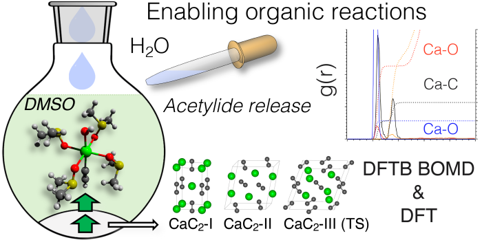 В своей последней работе исследователи из Института органической химии имени Н. Д. Зелинского РАН и Санкт-Петербургского государственного университета моделировали на атомарном масштабе процессы, протекающие при взаимодействии карбида кальция с водой и диметилсульфоксидом. Было показано, что при активации карбида в реакциях в растворе решающую роль играет природа источника протонов. Вода отлично подходит на эту роль за счет своей более низкой кислотности в ДМСО по сравнению с ацетиленом. Таким образом, динамика протолиза CaC2, протекающего на границе раздела фаз твердое тело-жидкость, вероятно, имеет первостепенное значение для дальнейшего понимания активации CaC2.