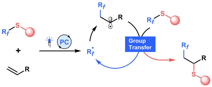 В рамках продолжения исследований сотрудников лаборатории №8 ИОХ РАН в области фторорганической химии был разработан процесс фторалкилирования-тиолирования алкенов при облучении синим светом. Наличие 4-тетрафторпиридинилтио-фрагмента в качестве фоторедокс-активной группы в исходном субстрате оказалось ключевым фактором для достижения высоких выходов продуктов дифункционализации. Разработанный метод можно рассматривать как универсальный подход к синтезу разнообразных фторированных соединений — важных структур в фармацевтике и агрохимии — из широкого ряда доступных алкенов.