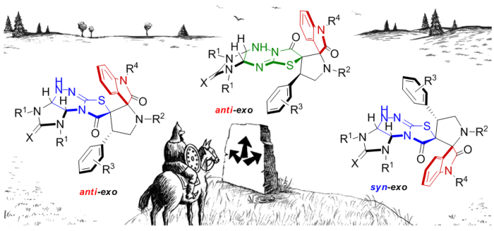 Исследователям лаборатории №19 ИОХ РАН удалось разработать эффективные и высокорегио- и диастереоселективные методы синтеза двух различных диастереомеров полиядерных диспирогетероциклических структур с пятью хиральными центрами. Реакции протекают как последовательность 1,3-диполярного циклоприсоединения и внутримолекулярной перегруппировки тиазолотриазинового фрагмента под действием щелочи. Интересно, что различный порядок стадий циклоприсоединения и перегруппировки позволяет проводить синтез двух разных диастереомерно чистых продуктов из одних и тех же исходных соединений.