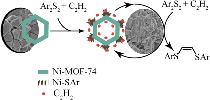 Исследователями лаборатории №30 ИОХ РАН под руководством академика В.П. Ананикова разработан гетерогенный катализатор на основе никеля и металлоорганических каркасов, который был протестирован в реакции присоединения дисульфида к газообразному ацетилену. Целевые соединения были получены с высокими выходами и в виде только одного цис-изомера. Уникальной особенностью полученного MOF является его способность стабилизировать гетерогенную форму катализатора за счет связывания образующегося в ходе процесса тиолата никеля со структурой MOF. В ходе исследования также было установлено, что использование MOF для каталитических целей зависит не только от его пористости, но и от его способности сохранять кристалличность и регулярность во время реакции.