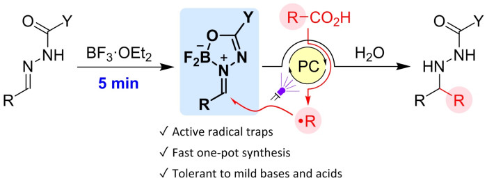 В Лаборатории функциональных органических соединений ИОХ РАН было обнаружено, что хелатные комплексы, получающиеся при взаимодействии N-ацилгидразонов, трифторида бора и аллилсилана, являются эффективными акцепторами алкильных радикалов. С использованием этой находки был разработан процесс синтеза α-разветвленных гидразинов реакцией этих комплексов с карбоновыми кислотами при облучении синим светом. В ходе реакции из карбоновых кислот генерируются алкильные радикалы, которые присоединяются по кратной связи углерод-азот. Предположительно, способность пятичленного борсодержащего цикла стабилизировать промежуточный радикал является ключевым фактором, определяющим эффективность реакции.