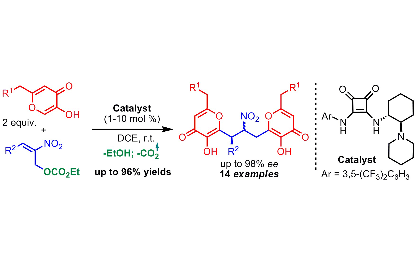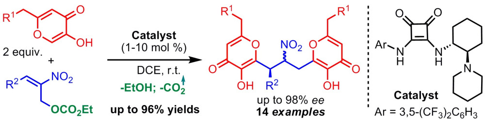 Ученые Лаборатории тонкого органического синтеза им. И.Н. Назарова ИОХ РАН ведут активные исследования в области асимметрического синтеза хиральных производных койевой кислоты. В своем последнем исследовании им удалось разработать новый асимметрический процесс двойного присоединения производных койевой кислоты к 2-нитроаллилкарбонатам. В результате реакции с высокой энантиоселективностью образуются нитросоединения с двумя гидроксипираноновыми фрагментами, недоступные другими методами. Ряд синтетических превращений с участием полученных структур позволил синтезировать хиральные нитроглутараты – перспективные предшественники энантиомерно чистых производных аминоглутаровой кислоты.