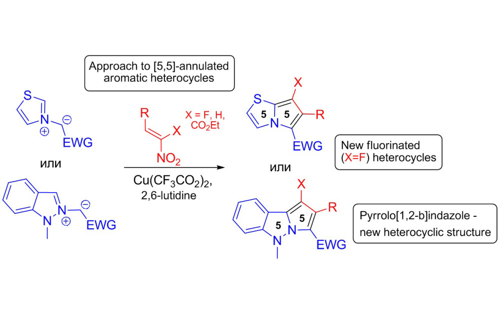 Researchers from the Laboratory of Organic and Metal-Organic Nitrogen-Oxygen Systems of the Zelinsky Institute proposed an effective method for the preparation of interesting [5,5]-annelated N-fused heterocycles such as as pyrrolo[2,1-b]thiazoles and pyrrolo[1,2-b]indazoles. At the same time, the tricyclic system of pyrrolo[1,2-b]indazole, which does not contain additional annulated rings, has not been previously reported at all. The method is based on the oxidative [3+2]-annulation reaction between nitroalkenes and azolium ylides in the presence of copper(II) salts. The process is applicable to a wide range of the starting substrates and produces the desired fused heterocycles in moderate to high yields. A detailed study of the reactivity, as well as the biological properties of the obtained compounds, is a promising area of research for organic chemists and medical chemists.