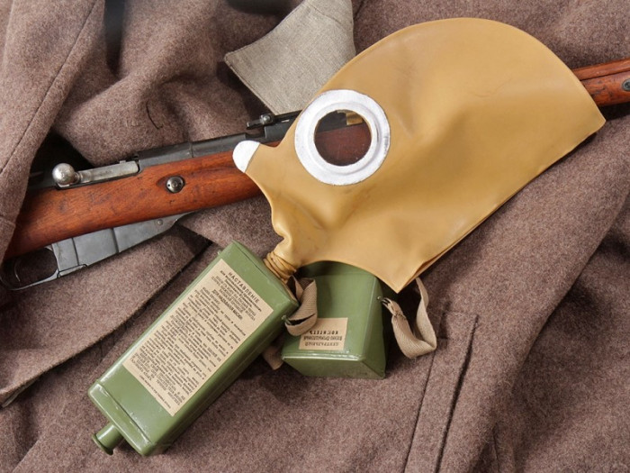 Русское командование довольно рано узнало о немецкой атаке на Ипре 22 апреля 1915 г. и сразу постаралось принять адекватные меры для защиты личного состава. В частности, еще в начале мая 1915 г. организации Красного Креста приступили к массовому изготовлению первых противохлорных масок. Эти простейшие средства противохимической обороны представляли собой компресс из пяти-шести слоёв марли, простроченный по краям и снабжённый двумя парами тесёмок для укрепления маски на лице (маска-повязка первого образца). Длина компресса около 15 см, ширина – 5-8 см. Напротив рта и носа располагался карман, в который вкладывалась пропитанная гипосульфитом корпия (растереблённая старая ветошь из льняной ткани, использовавшаяся как перевязочный материал). Фигуровский сообщает, что такие маски-повязки в начале мая 1915 года изготавливались в довольно значительных количествах, по крайней мере в Москве, Минске и Петрограде. Сейчас неизвестно какими данными руководствовались организации Красного Креста, когда рекомендовали для изготовления шести- или десятислойные марлевые маски — такая защита удерживала на себе слишком мало пропитки с «антихлором» и защищала в течение всего 2-3 мин. В лучшем случае, она давали солдатам возможность покинуть зараженную хлором территорию.