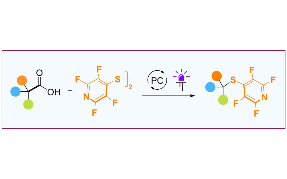 Currently, photoredox-catalyzed processes are being actively studied all over the world. Their main advantages are mild conditions, environmental friendliness, and compatibility with most functional groups. Scientists of the Laboratory of Functional Organic Compounds have developed a photoredox thiolation of carboxylic acids using disulfides with a tetrafluoropyridine fragment. The classical interaction of disulfides and carboxylic acids is often difficult. This is due to the formation of thiols during the reaction, which promote the undesirable process of a hydrogen atom transfer to the alkyl radical generated from the acid. As a result, the main product of the reaction will be an alkane, and not the target sulfide. Due to the use of a disulfide with a tetrafluoropyridine fragment by the researchers of the ZIOC it was possible to carry out a selective process for the formation of a carbon–sulfur bond. It is obvious that the reaction is possible due to the influence of fluorine atoms, which provide a favorable balance between the stages of the competitive transfer of a hydrogen atom and the transfer of a sulfide group. The developed approach makes it possible to successfully introduce into the reaction primary, secondary, tertiary, and heteroatom-substituted carboxylic acids, including natural polyfunctional compounds.