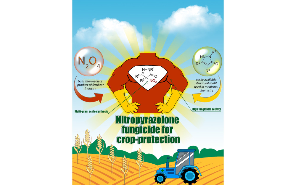 В качестве высокоактивных фунгицидов нового структурного типа учеными Лаборатории исследования гомолитический реакций ИОХ РАН предложены 4-замещенные-4-нитропиразолин-5-оны (нитропиразолоны). Исследователями был впервые предложен удобный, масштабируемый и атом-экономичный метод синтеза нитропиразолонов. Такой подход применим для мультиграммового синтеза и позволяет производить широкий спектр нитропиразолонов с высокими выходами и чистотой, делая их легкодоступными продуктами. Синтезированные соединения проявили высокую фунгицидную активность в отношении широкого спектра фитопатогенных грибов (Venturia inaequalis, Rhizoctonia solani, Fusarium oxysporum, Fusarium moniliforme, Bipolaris sorokiniana, Sclerotinia sclerotiorum). Их ингибирующая активность в отношении роста мицелия была сравнима или превосходила активность современного коммерческого действующего вещества —крезоксим-метила. Активность in vitro против Candida albicans и Aspergillus niger показала, что нитропиразолоны также активны против грибов, патогенных для человека. Установлены ключевые структурные факторы, необходимые для проявления высокой фунгицидной активности: ароматический заместитель у атома N1 и малые заместители в положениях С3 и С4 пиразолонового цикла.