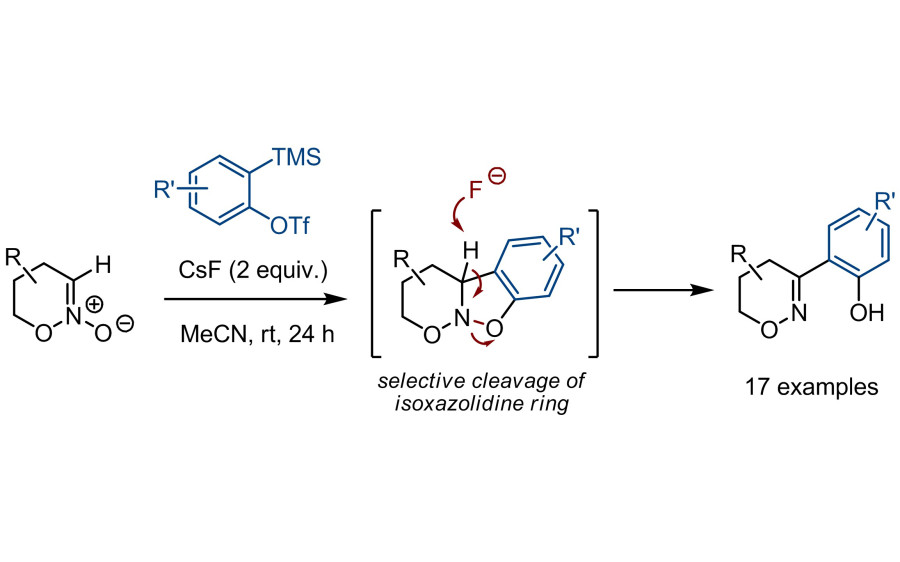Researchers from the Laboratory of Organic and Metal-Organic Nitrogen-Oxygen Systems of the ZIOC developed a method for the synthesis of 1,2-oxazine derivatives based on a previously unknown reaction of cyclic nitronates with aryne precursors. The process goes as a [3+2]-cycloaddition followed by fragmentation of the nitrosoacetal fragment, which was confirmed by the isolation of intermediate cycloadducts. The synthetic use of the obtained structures was demonstrated by the example of their stereoselective reduction to 1,4-aminoalcohols and reductive contraction of the 1,2-oxazine ring to tetrahydrofuran derivatives.