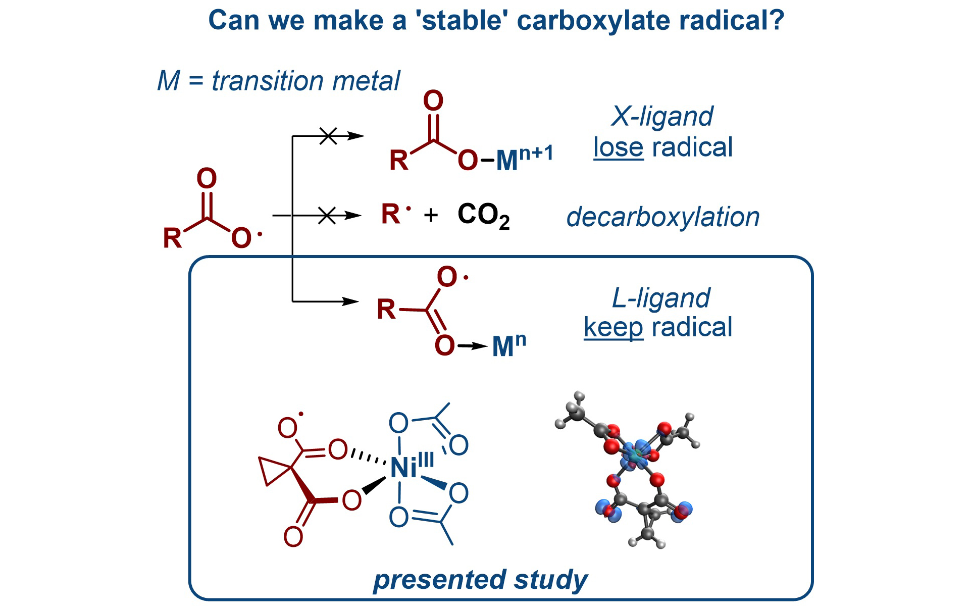 Как правило, карбоксилатные радикалы связываются с металлом как X-лиганд и теряют радикальный характер. С использованием расчетных и экспериментальных методов авторы обнаружили, что существует способ сделать карбоксилат монодентатным L-лигандом и сохранить радикальный характер. Показано, что карбоксилатный радикал действует как L-лиганд с некоторыми высокоспиновыми центрами переходных металлов. Такая координация сохраняет O-радикальный характер, необходимый для активации C-H связи через перенос атома водорода. Перехват нового C-радикала металлом и последующее восстановительное элиминирование приводит к формальному ацилоксилированию C-H связи.