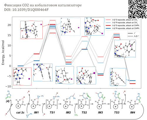 В этой работе методами квантовой химии был изучен механизм каталитического связывания CO2 в мягких условиях. Расчёты показали, что лимитирующая стадия изучаемой реакции отличается от описанных в литературе для похожих реакций. Кроме того, было дано объяснение наблюдаемому в ходе эксперимента влиянию концентраций низкомолекулярных веществ на ингибирование катализа.