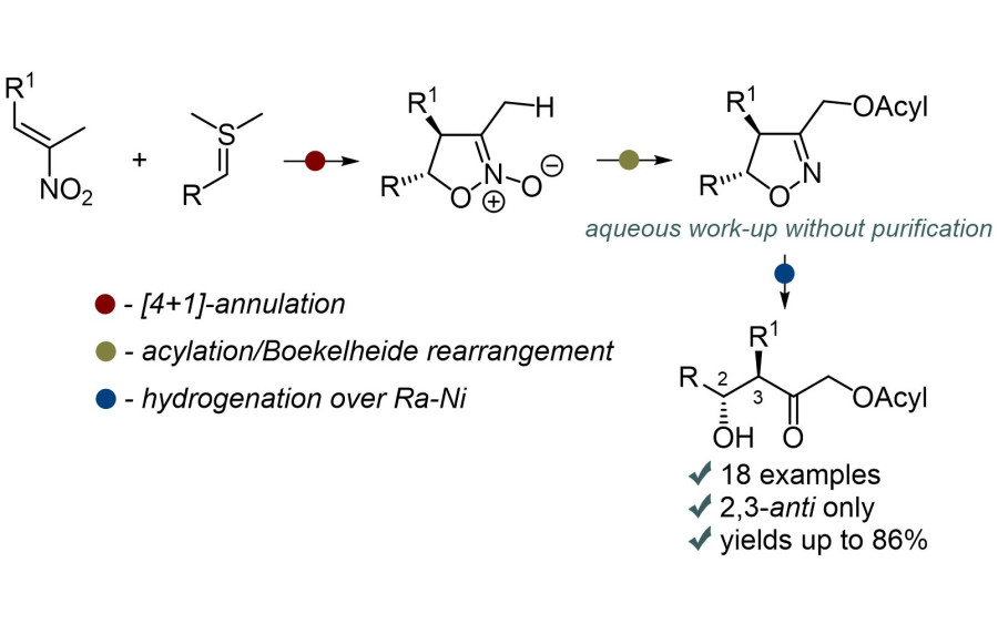 Исследователями Лаборатории органических и металл-органических азот-кислородных систем ИОХ РАН был предложен альтернативный региоселективный путь к изоксазолинам, состоящий из [4 + 1]-аннелирования нитроалкенов с илидами серы и последующей перегруппировки Бекельхейда. Гидрогенолиз изоксазолинового кольца приводит к образованию α'-ацилоксизамещенных альдолей, труднодоступных известными синтетическими путями. В ходе работы была также продемонстрирована применимость полученных альдолей для сборки стереохимически сложных каркасов природных соединений. Разработанный подход может найти применение в стереоселективном полном синтезе фармацевтически значимых молекул.