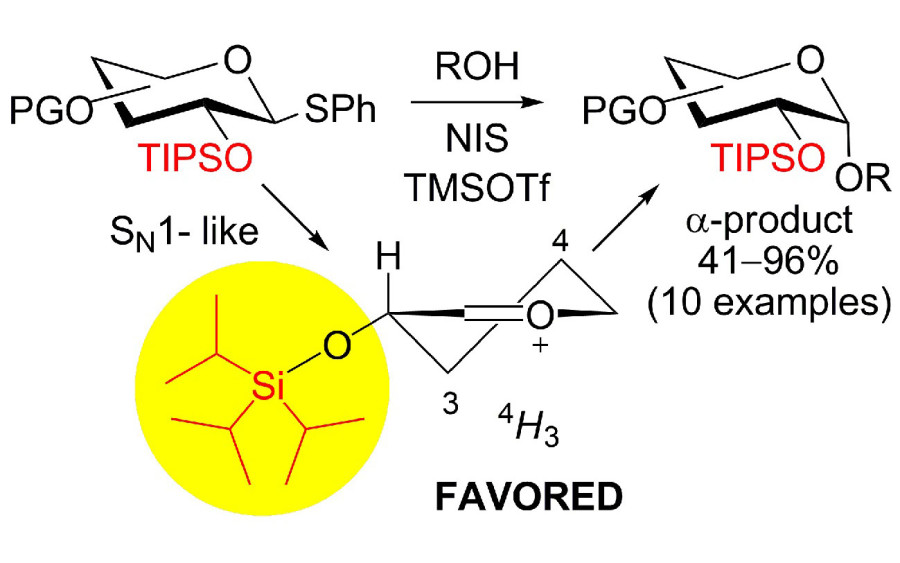 Исследователи Лаборатории гликохимии ИОХ РАН синтезировали новые гликозил-доноры на основе глюкопиранозы с одной или двумя триизопропилсилильными (TIPS) группами, не содержащие бензильных фрагментов. Полученные соединения были использованы для изучения стереоселективности a-глюкозилирования. Установлено, что гликозилирование фенил-3,4,6-три-О-бензоил-2-О-TIPS-1-тио-b-D-глюкопиранозидом(1) с одной TIPS группой при O-2 является высоко стереоселективным (a/b≥10:1), в то время как использование гликозил-донора, содержащего две TIPS группы при О-2 и О-3, приводит к потере a-стереоселективности (a/b = 3:1). В ходе исследования была выявлена зависимость результата a-глюкозилирования от нуклеофильности ряда гликозил-акцепторов. Полный a-стереоконтроль гликозилирования с помощью 2-О-TIPS содержащего глюкозил донора 1 достигается при гликозилировании слабых нуклеофилов. В этом случае глюкозилирование, по-видимому, протекает по SN1-подобному маршруту через гликозил катион, закрепленный в 4H3 конформации, в которой объемная TIPS группа при O-2 занимает псевдо-экваториальное положение. Полученные результаты являются важным вкладом в разработку эффективных и стереоселективных методов синтеза широкого ряда гликоконъюгатов.
