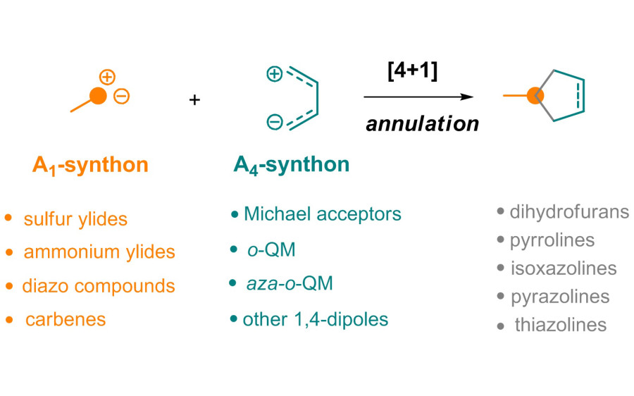 Пятичленные гетероциклы, содержащие один или несколько гетероатомов, являются важными полупродуктами в органическом синтезе на пути к биоактивным и природным соединениям. В последние годы для построения таких циклов активно развивается подход [4+1]-аннелирования, позволяющий осуществлять стереоселективную сборку полизамещенных пятичленных колец из доступных исходных соединений за одну синтетическую стадию. Стоит также отметить, что эта методология совместима с асимметричным металло- и органокатализом, что позволяет проводить процесс энантиоселективно.