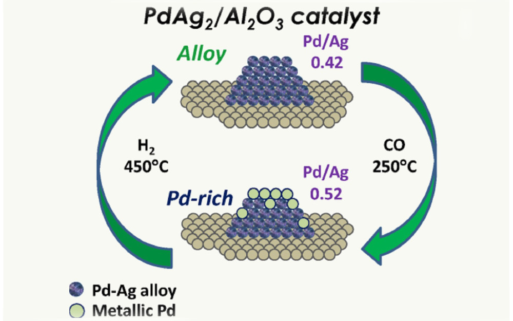 Ученые Лаборатории катализа нанесенными металлами и их оксидами ИОХ РАН совместно с коллегами из Института катализа им. Г.К. Борескова РАН активно ведут исследования по поиску эффективных катализаторов селективного гидрирования различных алкинов. Одна из их последних работ посвящена разработке практических методов «настройки» структуры поверхности Pd-Ag наночастиц для улучшения их каталитических характеристик в селективном гидрировании ацетилена до этилена. Проведенные эксперименты показали, что дозированная обработка нанесенного палладий-серебряного катализатора в потоке СО вызывает сегрегацию атомов палладия на поверхность биметаллических частиц Pd-Ag. Такое контролированное изменение структуры поверхности позволяет существенно увеличить активность катализатора при сохранении 100 % селективности. Полученные результаты доказывают, что сегрегация, индуцированная адсорбцией CO, является мощным инструментом, который можно эффективно использовать для управления структурой поверхности и каталитическими характеристиками биметаллических нанокатализаторов.