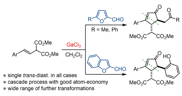 В рамках работ по проекту РНФ №19-73-00258, который был посвящен изучению химических свойств β-стирилмалонатов, в 2021 году нами была опубликована статья в журнале Journal of Organic Chemistry. В ней мы изучили взаимодействие между β-стирилмалонатами и производными фурфурола в присутствии GaCl3. Нам удалось разработать подход к синтезу тризамещенных циклопентенонов, содержащих фрагмент 1,4-дикетона. Реакции протекали высоко диастереоселективно и с высокими выходами конечных продуктов. Следует отметить, что наличие 1,4-дикетонового фрагмента в образующихся циклопентенонах позволило осуществить обширную модификацию данных соединений. Это позволило получить ряд функционализированных гетероциклических соединений с высокими выходами.