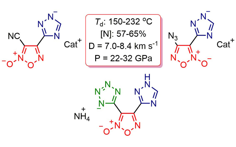 Одним из самых перспективных классов высокоэнергетических материалов являются структуры, содержащие несколько азотсодержащих гетероциклических фрагментов. Одним из ключевых подходов к получению высокоэнергетических материалов со сбалансированным набором физико-химических свойств является комбинация структурно разнообразных гетероциклов с большим количеством атомов азота. Этот подход был применен исследователями Лаборатории азотсодержащих соединений ИОХ РАН для получения (1,2,4-триазолил)фуроксанов с хорошими детонационными характеристиками и пониженной чувствительностью. Однако известно, что NH-фрагмент 1,2,4-триазольного кольца обладает кислотностью, что может стимулировать коррозию, которая является крайне нежелательной для прикладного использования таких материалов. Для решения этой проблемы в одной из своих последних работ ученым удалось синтезировать высокоэнергетические соли (1,2,4-триазолил)фуроксанов в качестве анионов и различных полиазотных оснований в качестве катионов. Несколько полученных структур обладают отличной термической стабильностью, а сочетание хороших экспериментальных плотностей и высоких положительных расчетных энтальпий образования обеспечивает хорошие детонационные характеристики синтезированных высокоэнергетических солей.