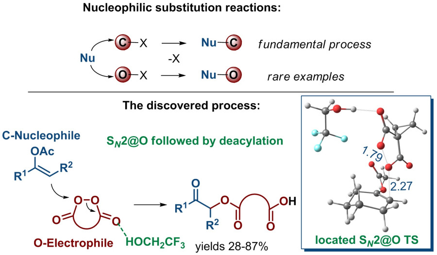 Ученые Лаборатории исследования гомолитический реакций и группы теоретичской химии ИОХ РАН совместно с коллегами из Университета штата Флорида (Florida State University) предложили неожиданную альтернативу общепринятым подходам к созданию С-О связей — взаимодействие O-электрофилов, таких как органические пероксиды, с углеродными нуклеофилами. Было обнаружено, что нуклеофильное замещение при атоме кислорода циклических диацилпероксидов электронно-насыщенным атомом углерода енолацетатов с последующим деацилированием приводит к α-ацилоксикетонам с дополнительной карбоксильной группой. Анализ процесса квантово-химическими методами показал, что ключевая стадия протекает как бимолекулярная нуклеофильная реакция замещения (SN2) при атоме кислорода (SN2@O). Используемый растворитель CF3CH2OH играет двойную роль, помогая на обоих этапах реакционного каскада: он снижает энергию активации SN2@O за счет образования водородной связи с отдаленным карбонилом и способствует деацилированию промежуточного катионного интермедиата.