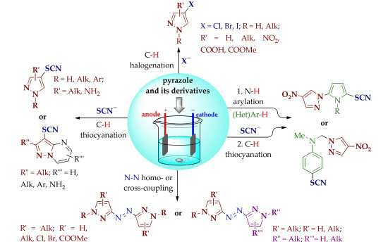 В нашем обзоре впервые обобщены данные (преимущественно собственные) по эффективным методам электрохимического синтеза практически ценных галогено-, тиоцианато-, арил- и азопиразолов, а также по ключевым закономерностям реализации соответствующих процессов. Особо отмечена возможность предварительного тестирования эффективности электросинтеза с помощью метода циклической вольтамперометрии, в том числе использование редокс-потенциала исходных пиразолов в качестве одного из критериев их реакционной способности.