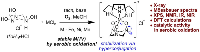 Образование устойчивых комплексов d-металлов с формальдоксимом известно с конца XIX века и широко применяется в спектрофотометрическом анализе. Однако структура этих координационных соединений была неизвестна. Нам удалось впервые структурно охарактеризовать эти комплексы для железа, марганца и никеля и показать, что лигандом в них выступает не формальдоксим, а его циклотример. При этом сами комплексы имеют уникальную адамантаноподобную структуру с атомом металла в нетипичной степени окисления +4. Изучив электронную структуру различными физико-химическими и расчетными методами нам удалось объяснить феномен стабилизации высокоокисленного состояния металла циклотримером формальдоксима. Интересно, что сами эти комплексы образуются из соответствующих солей Fe(III), Ni(II) и Mn(II) при окислении воздухом.