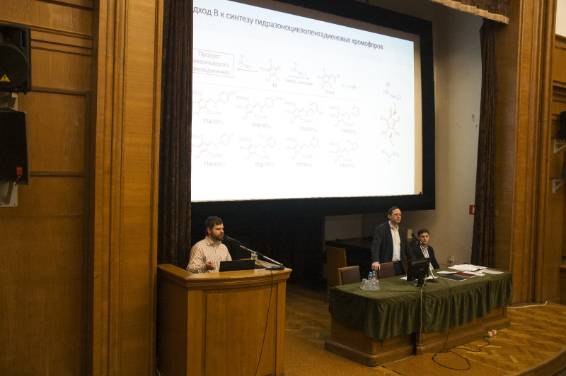 Константин Павлович Трайнов представил диссертацию на соискание ученой степени кандидата химических наук по теме «Синтез и изучение спектральных свойств донор-π-акцепторных хромофоров на основе электронодефицитных гидразоноциклопентадиенов». Работа выполнена под руководством заведующего Лабораторией химии диазосоединений № 6 ИОХ РАН д.х.н., проф. Томилова Юрия Васильевича.