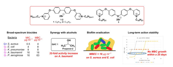 Последняя высокорейтинговая работа 2021 года являлась обзорной и была направлена на систематизацию биологически активных веществ класса четвертичных аммониевых соединений и ионных жидкостей. Нами была проведена работа по поиску антибактериальных соединений данного класса, синтезированных за последние несколько лет, в соответствии с выделенными подгруппами (на рисунке). Основная цель работы – помочь ученым разобраться в данном классе биоцидов, показать текущую ситуацию и дать направление для будущих исследований противомикробных ЧАС. Кроме того, ранее нами был разработан простой двухстадийный способ получения новых биспиридиниевых солей (БПС) на основе ароматических соединениий (бифенила и бифенилового эфира). Данный метод может применяться для синтеза БПС из практически любых дигидрокси- и дибромароматических производных. В последней же работе мы раскрыли потенциал полученных БПС в качестве биоцидов. Широкие микробиологические исследования показали способность новых соединений к разрушению бактериальных биопленок, их синергетический эффект со спиртами и самое главное – устойчивое антибактериальное действие в течении длительного периода (25 дней) без образования резистентности. Полученные результаты создают фундамент для теории о том, что ароматические фрагменты в спейсере БПС затормаживают механизмы образования резистентности у грамотрицательных патогенных бактерий.