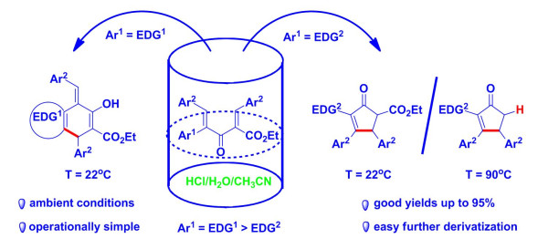 Мы были нацелены на синтез биологически-активных аналогов комбретастатина А-4 с помощью циклизации поляризованных арилзамещенных диенонов. В разработке нашего подхода мы также преследовали цель создать максимально не токсичный и экологичный способ, поэтому для циклизации были подобраны условия по так называемому протоколу "on-water". Данный, очень удачный подбор условий реакции оказался возможным благодаря низкой энергии активации субстратов и их амфифильности.