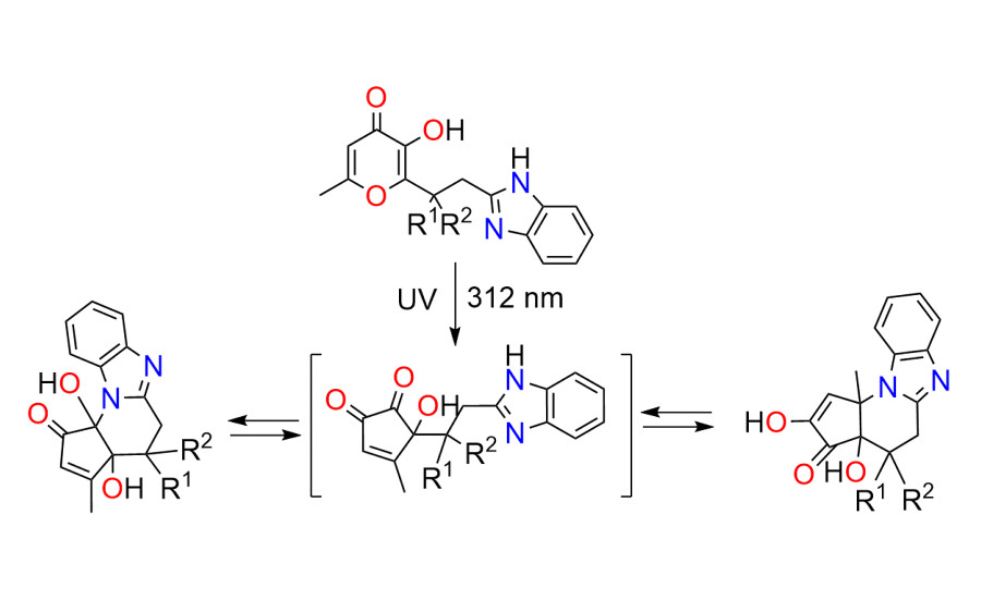Ученые Лаборатории гетероциклических соединений ИОХ РАН продолжают исследования фотохимического поведения производных 3-гидроксипиран-4-онов (алломальтола). Ключевой особенностью данного класса соединений является фотоиндуцированный внутримолекулярный перенос протона в возбужденном состоянии (ESIPT-процесс). В результате такой фотореакции происходит сужение пиранонового цикла и образование нестабильных α-гидрокси-1,2-дикетонов. Данные интермедиаты могут быть уловлены как с использованием внешних реагентов, так и с помощью различных функциональных групп, входящих в состав боковой цепи алломальтола. В одной из своих последних работ авторы предложили использовать азотсодержащий гетероциклический фрагмент для улавливания нестабильных α-гидрокси-1,2-дикетонов. Ими были получены производные 3-гидроксипиран-4-онов, содержащих бензимидазольный остаток. Было показано, что под действием УФ-облучения исследуемые продукты претерпевают ESIPT-индуцированное сжатие пиранонового цикла и последующую циклизацию с участием бензимидазольного фрагмента. В результате реакции образуются производные бензо[4,5]имидазо[1,2-а]циклопента[е]пиридина. Исследователи также показали, что синтезированные продукты существуют в виде взаимопревращающейся смеси таутомеров в растворе и в виде единственного таутомера в кристаллической форме. В то же время, несмотря на наблюдаемую в растворе таутомерию, дальнейшие химические превращения смеси фотопродуктов протекают региоспецифично и приводят к образованию производных одной или другой изомерных форм, строение которых было однозначно подтверждено рентгеноструктурным анализом.