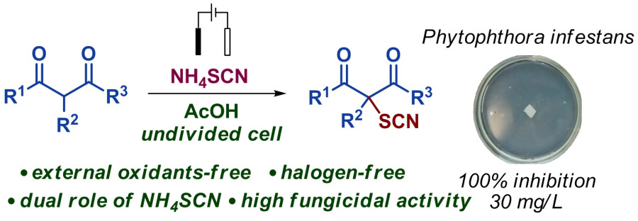 В Лаборатории исследования гомолитических реакций ИОХ РАН разработан метод тиоцианирования 1,3-дикарбонильных соединений под действием электрического тока без использования стехиометрических количеств «материальных» окислителей. Реакция протекает в конструкционно простой неразделённой ячейке при постоянном токе. Получен широкий ряд тиоцианатов с выходами 37-82%. Обнаружено, что процесс протекает с высокой эффективностью только в уксусной кислоте. Предположительно, тиоцианирование 1,3-дикарбонильных соединений начинается с образования (SCN)2 из SCN-аниона в результате анодного окисления, дальнейшее присоединение (SCN)2 по двойной связи енольной формы 1,3-дикарбонильного соединения приводит к целевому продукту.