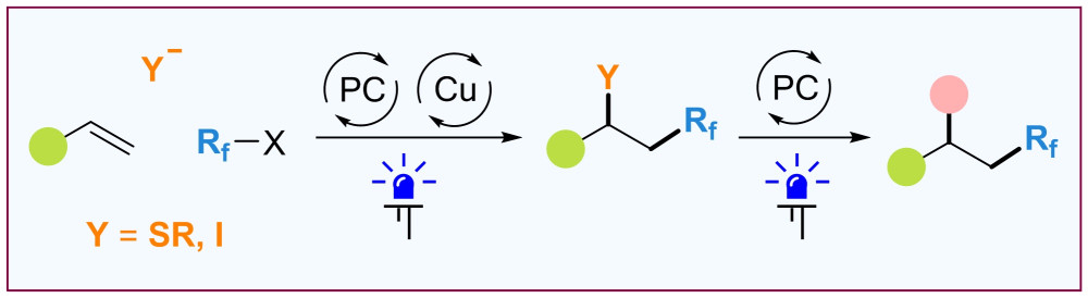 Scientists from the Laboratory of Functional Organic Compounds of the ZIOC under the conditions of dual catalysis, managed to realize the process of difunctionalization of alkenes with the participation of fluorinated organic halides, as well as S-centered nucleophiles or iodide anions, using a cyanoarene-type photocatalyst and a copper (I) complex. Presumably, during the photocatalytic cycle, fluorinated radicals are generated, and the copper complex promotes the formation of a carbon-heteroatom bond due to the interception of the resulting radicals by copper sulfide or iodide species. Thiazolinyl- and perfluoropyridinylthiolates were used as S-nucleophiles, and the sulfides formed in the reaction can be further transformed through C-S bond cleavage under photocatalytic conditions. Thus, the overall developed process of alkenes difunctionalization proceeds with the formation of two C–C bonds and leads to the production of polyfunctional organofluorine compounds that are difficult to access by other methods.