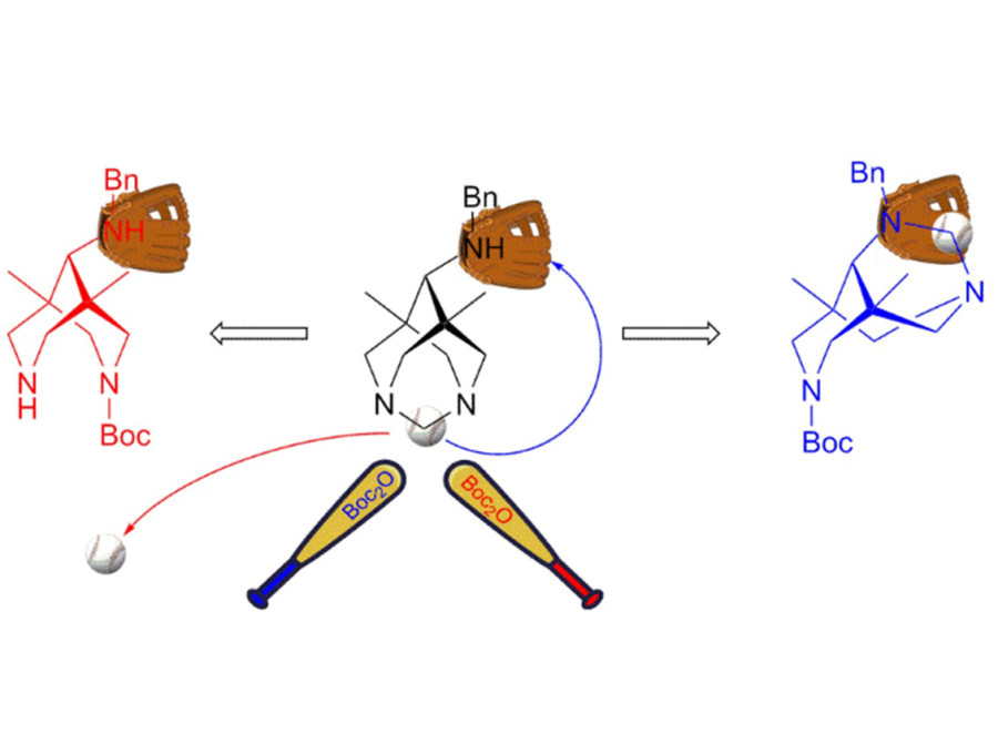Учеными Лаборатории супрамолекулярной химии ИОХ РАН предложен принципиально новый подход к синтезу несимметричных биспидинов, а именно использование аминогруппы в шестом положении диазаадамантана в качестве направляющей. Электрофильное раскрытие аминального метиленового мостика в диазаадамантане в подобранных условиях позволило получить ранее не описанную гетероциклическую систему 1,5,9-триазатрицикло[5.3.1.03.8]ундекана. Определение структуры интермедиатов реакции удаления аминального мостика позволило предложить механизм этой реакции. В ходе исследования впервые удалось получить тризамещенные биспидины, содержащие три различные защитные группы, которые могут быть удалены в разных условиях.