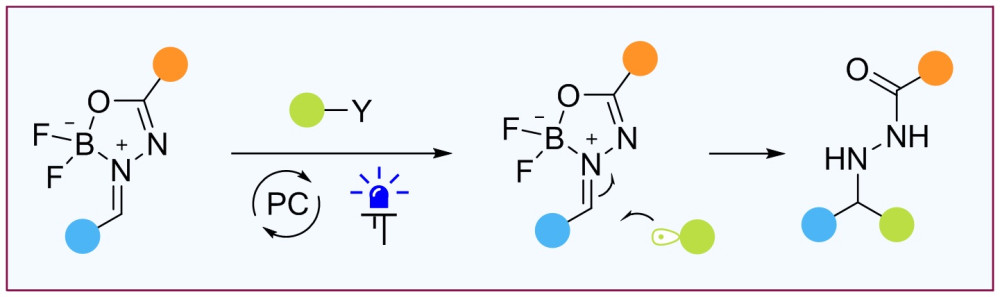 Ученые Лаборатории функциональных органических соединений ИОХ РАН в одной из своих недавних работ предложили новые реагенты для перехвата алкильных радикалов, генерируемых в условиях фоторедокс катализа — пятичленные дифторборилхелатные комплексы на основе азометинов. Сами азометины имеют некоторые ограничения по участию в радикальных реакциях, связанные с пониженной реакционной способностью связи C=N или с особыми условиями образования радикальных частиц. Превращение азометинов в соответствующие дифторборные хелатные комплексы позволяет успешно перехватывать алкильные радикалы, образующиеся при облучении светом из самых разнообразных предшественников: алкилтрифторборатов и алкилсиликонатов, эфиров Ганча, аминалей антраниламидов, сложных эфиров N-гидроксифталимида, солей Катрицкого, алкилиодидов и тиолов. Разработанный подход открывает путь к синтезу широкого ряда полифункциональных азотсодержащих соединений.