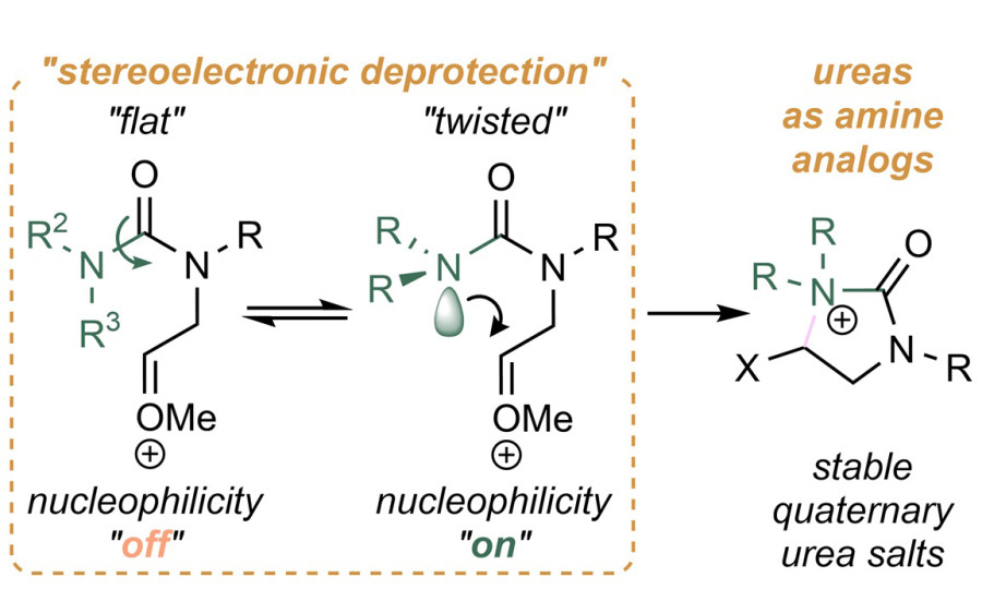 Международным коллективом ученых из ИОХ РАН, ИОФХ РАН и Университета Флориды (США) обнаружены новые грани реакционной способности замещенных мочевин. Осуществление таких процессов стало возможным благодаря вращению вокруг одной из C-N связей мочевины, которое выключает амидный резонанс и увеличивает нуклеофильность одного из атомов азота. Важную роль в этом случае играет характер замещения мочевин: наиболее замещенные мочевины являются более гибкими, так как потеря резонанса в таких системах сопровождается снятием стерического напряжения. Использование такой «конформационной настройки» позволило осуществить синтез необычных солей 2-оксоимидазолия, содержащих четвертичные атомы азота в остатке мочевины. Предполагается, что этот подход не ограничится мочевинами и найдет дальнейшее применение в органическом синтезе.