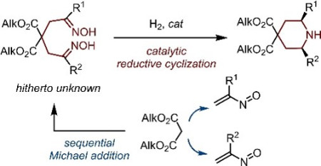 В 2022 году коллективом нашей лаборатории была опубликована статья в журнале Advanced Synthesis and Catalysis, посвященная разработке нового метода синтеза пиперидинов из диоксимов 1,5-дионов путем каталитической восстановительной циклизации. Исходные оксимы 1,5-дионов были получены по ранее неизвестной реакции двойного последовательного присоединения двух молекул нитрозоалкенов к молекуле диалкилмалоната. Обычно оксимы получают из кетонов путем реакции последних с гидроксиламином, однако этот классический подход имеет ряд ограничений, когда речь заходит о синтезе диоксимов. Эти ограничения связаны с неустойчивостью 1,5-дикетонов, способных к различным реакциям внутримолекулярной конденсации. Предложенный нами способ синтеза 1,5-диоксимов этого ограничения не имеет, он прост в лабораторной реализации, а необходимые нитрозоалкены могут быть легко сгенерированы из их более устойчивых нитрозоацеталей, легко синтезируемых из обычных коммерчески доступных нитроалканов. Эта реакция позволила нам синтезировать большую серию различных несимметрично-замещенных 1,5-диоксимов, которые затем были подвергнуты реакции каталитической восстановительной циклизации с образованием целевых пиперидинов. Катализатором этого процесса выступил никель Ренея, дешевый и доступный гетерогенный катализатор, легко отделяемый от реакционной смеси обычным магнитом. Нами также были проведены эксперименты по определению механизма открытой нами реакции и предложен удобный метод определения структуры используемых диоксимов, основанный на применении квантово-химических расчетов.