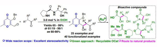 Исследования нашей научной группы направлены на поиск новых органокаталитических подходов к синтезу хиральных биоактивных соединений, в том числе и конкретных лекарственных препаратов. В настоящее время мы изучаем реакции создания новых углерод-углеродных связей (альдольная реакция, реакции Михаэля, Манниха) с участием альдегидов, оснований Шиффа, нитроалкенов, содержащих в своей структуре пироновый или хромоновый цикл. Продукты этих реакций, образующиеся с высокой степенью энантиомерной чистоты, путем расщепления этих циклов легко превращаются в соответствующие кислоты и их производные – ценные биологически активные соединения.
