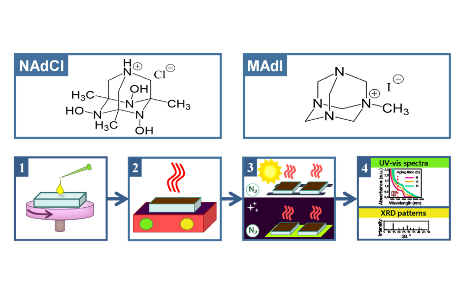 Международный коллектив ученых при участии исследователей из ИОХ РАН работает над изучением возможности использования производных адамантана и азаадамантана в качестве стабилизирующих модификаторов, улучшающих рабочие характеристики и стабильность перовскитных солнечных элементов. В одной из последних работ было проведено сравнительное исследование влияния добавок четвертичных производных 1,3,5,7-тетраазадамантана (уротропина) и 1,4,6,10-тетраазаадамантана (изоуротропина) на фото- и термостабильность поликатионных перовскитов на основе галогенидов свинца. Показано, что 1,4,6,10-тетраазаадамантан с тремя ОН-группами, присоединенными к атомам азота, и протонированной вершиной третичного амина, проявляет впечатляющий стабилизирующий эффект в двух типах перовскитных материалов. С использованием набора взаимодополняющих экспериментальных и теоретических подходов была объяснена наблюдаемая стабилизирующая способность. Разработанные поглощающие материалы обладают рекордными показателями стабильности среди перовскитов на основе галогенидов свинца. Полученные результаты являются весомым вкладом на пути внедрения перовскитной фотоэлектрической технологии в массовое потребление.