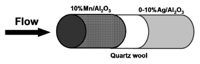 Недавняя серия публикаций сотрудников Лаборатории катализа нанесенными металлами и их оксидами ИОХ РАН посвящена изучению свойств катализаторов реакции ОЗКО углеводородов и СО. Так, учеными был предложен оригинальный двухзонный Mn/Al2O3||Ag/Al2O3 катализатор, в котором Mn-содержащий компонент отвечает за окисление углеводородов, а Ag-содержащий компонент – за окисление СО и разложение О3. Подобная конфигурация каталитического блока позволяет эффективно проводить реакцию окисления ЛОС даже при низких температурах (< 100°С), а также минимизировать образование СО.