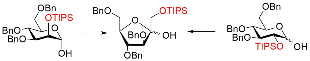 Полисахариды бактериального и растительного происхождения, имеющие в составе остатки β-D-фруктофуранозы, могут быть использованы в качестве влагоудерживателей, загустителей и желирующих агентов, а также терапевтических агентов с противоопухолевой, антиоксидантной, антимутагенной и иммуностимулирующей активностью. В одной из последних работ ученых Лаборатории гликохимии ИОХ РАН была изучена изомеризация О-бензилзащищенных производных D-манно- и D-глюкопиранозы в производные фруктофуранозы, протекающая в основных условиях. В ходе исследования было показано, что для успеха изомеризации необходимо, чтобы в положении O-1 или O-2 молекул исходных соединений присутствовала объемная триизопропилсилильная (TIPS) группа. Полученные результаты являются важным вкладом в разработку эффективных методов синтеза селективно защищенных производных моносахаридов в фуранозной форме.