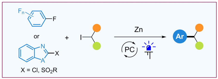 Учеными Лаборатории функциональных органических соединений ИОХ РАН разработан метод алкилирования аренов в условиях фоторедокс-катализа с использованием цинкорганических соединений, генерируемых in situ из иодалканов и цинка. Это превращение является формальным нуклеофильным ароматическим замещением. Его ключевой стадией является атака алкильного радикала, образующегося в результате фотоокисления цинкорганического соединения, на электронодефицитную π-систему. Предложенный подход применим к широкому ряду полифторированных аренов, а также к 2-хлорбензоксазолам и 2-сульфонилзамещенным бензотиазолам.