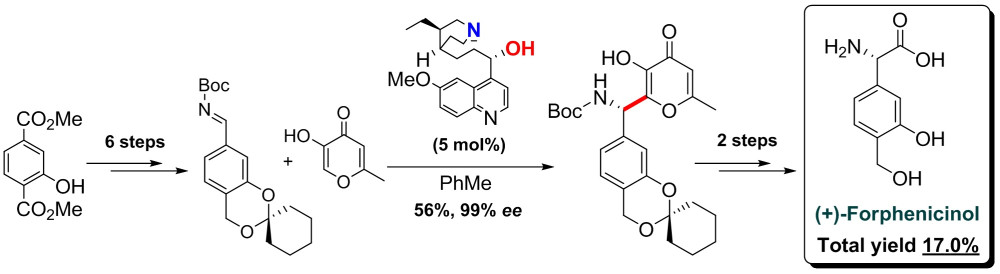 Важность исследований в области асимметрического органокатализа была отмечена присуждением Нобелевской премии в 2021 г. Бенджамину Листу и Дэвиду МакМиллану — ученым, стоявшим у истоков этой области органической химии. В настоящее время актуальным является внедрение методов асимметрического органокатализа в практику медицинской химии и современные фармацевтические технологии. Учеными Лаборатории тонкого органического синтеза им. И.Н. Назарова ИОХ РАН предложен эффективный девятистадийный полный синтез (S)-форфеницинола – действующего вещества иммуномодулирующего и противоракового средства Форфенимекс. Ключевой стадией синтеза, приводящей к образованию стереогенного центра, является энантиоселективное присоединения алломальтола, полученного из койевой кислоты, к N-Boc-защищенному основанию Шиффа, по реакции Манниха, катализируемой гидрохинином (недорогим хиральным органокализатором природного происхождения). Последующие стадии окислительной фрагментация γ-пиронового фрагмента в α-положении по отношению к аминогруппе и снятия защитных групп позволили получить энантиомерно чистую целевую аминокислоту. Общий выход (S)-форфеницинола (99% ee) по предложенной схеме синтеза (17%) значительно превышает результаты, получаемые известными методами (4,6% и 0,8%).